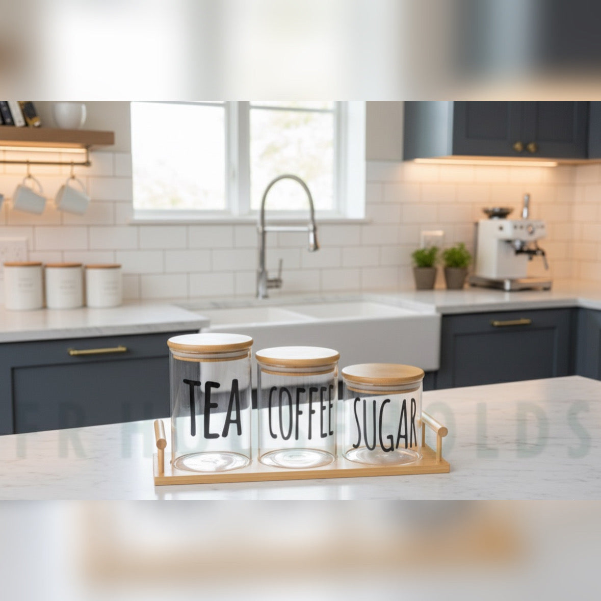 3pcs Airtight Round Glass Jars Set for Tea, Coffee & Sugar with Bamboo Lids and Stand - 1000g Jar | 1000g - 750g & 500g