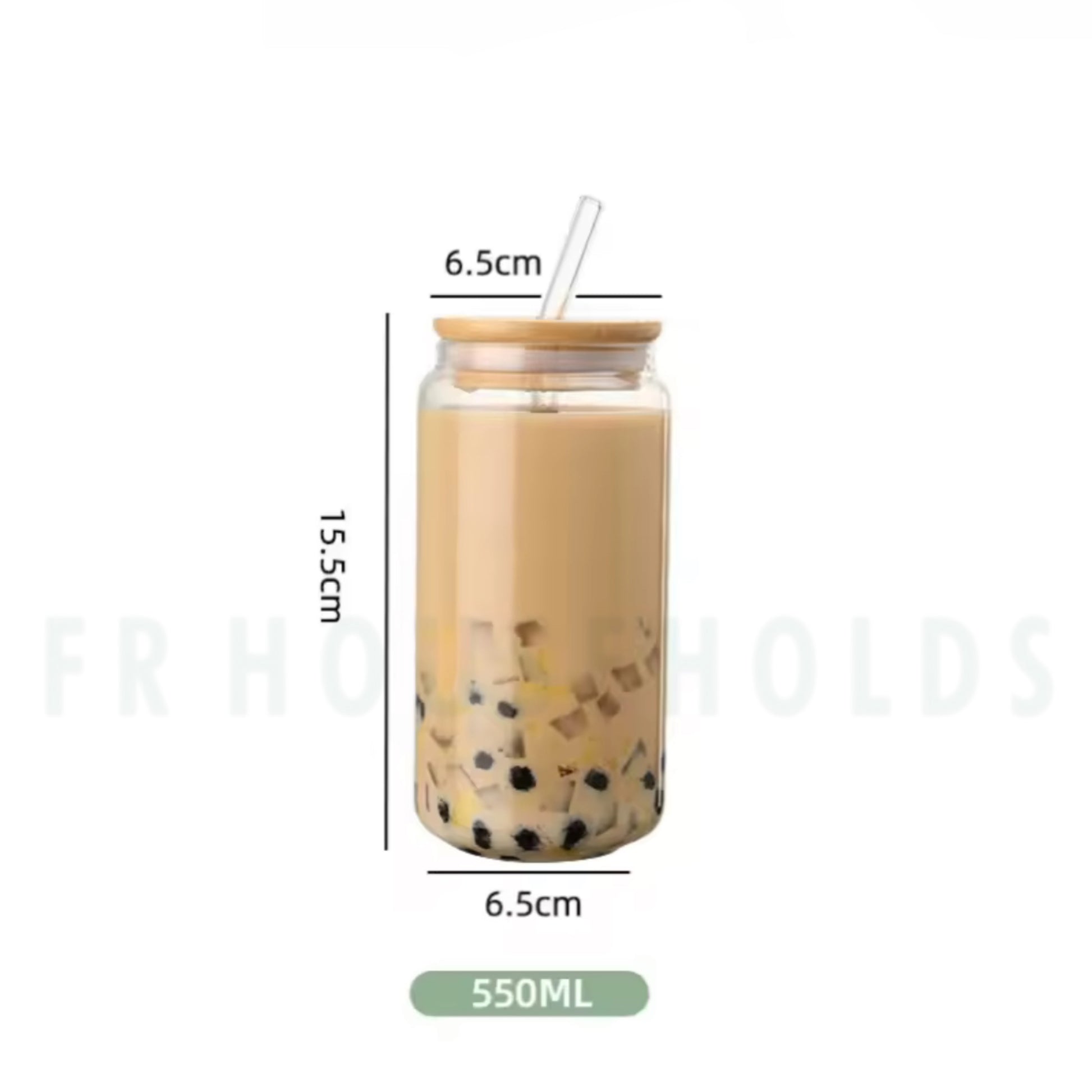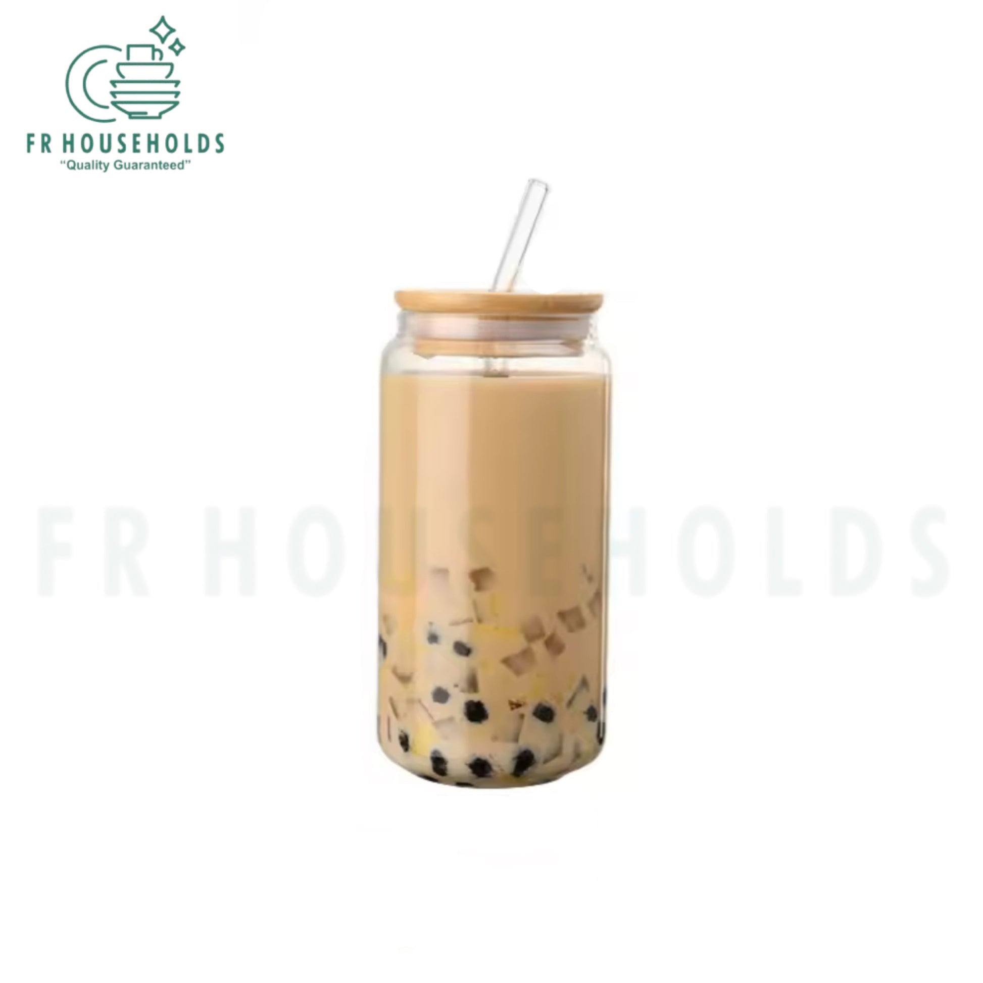 The can-shaped design gives it a trendy café look, while the natural bamboo lid and reusable glass straw make it both aesthetic and eco-friendly — ideal for iced coffee, tea, smoothies, juices, milkshakes, or fruit-infused water. Perfect for home cafés, offices, or on-the-go sipping! 💛